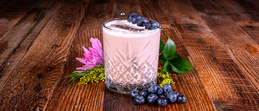 house-infused chamomile gin, blueberry chai syrup, fresh blueberries, lemon citrus, yuzu citrus, cream, one whole egg, lemon oil, fresh blueberry garnish