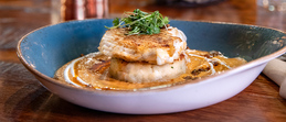 spiced halibut, crab hash cake, pumpkin-habanero sauce, lime crème, roasted pumpkin seeds, micro cilantro