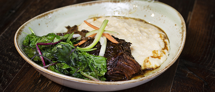 cheese grits, wilted greens, applewood smoked bacon, sherry vinaigrette, natural jus