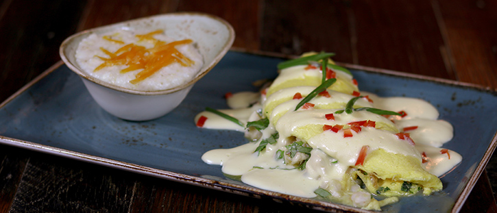 lump crabmeat, fresh dill, asparagus, spinach, chives, white cheddar cheese, hollandaise sauce