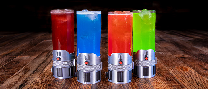 served in a light saber, choice of alcohol-free campari (bitter), creme de violette (fruity), midori (sour), or blue spirulina (sweet)