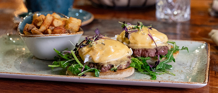 grilled filet, poached eggs, toasted english muffin, arugula, béarnaise sauce, microgreens *Eggs, salmon, hamburgers and steaks may be served raw or undercooked. Consuming raw or undercooked meats, poultry, seafood, shellfish, or eggs may increase your risk of foodborne illness. Listed weights are measured before cooking