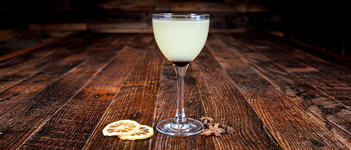 jacob’s corpse reviver #2 with a twist – traditional french absinthe, fresh-squeezed lemon juice, french orange liqueur, french aromatized white wine aperitif, organic gin rinse, luxardo cherry