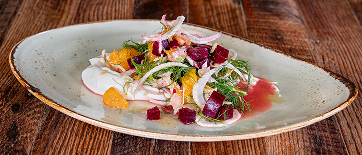 roasted beets, shaved fennel, honey ricotta, mandarin oranges, white balsamic gastrique add chicken $6, add shrimp $7, add salmon* $8