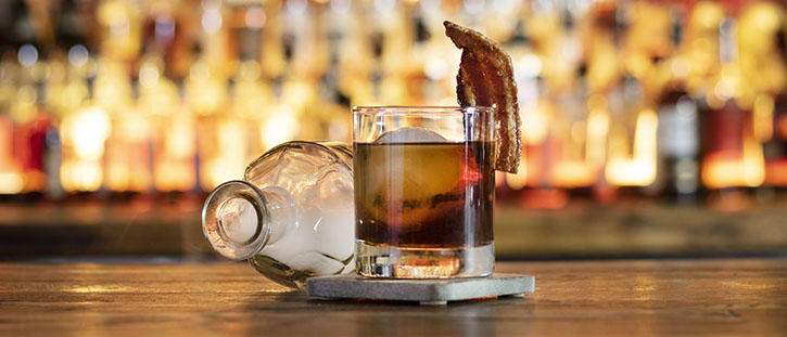 breakfast old-fashioned – bottle-in-bond kentucky straight bourbon whiskey, bourbon maple syrup, orange oil, black walnut and abbott’s bitters, bourbon-soaked oak smoke, candied bacon