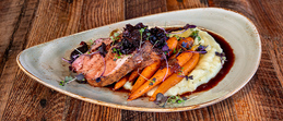 pork loin, celery root purée, heirloom carrots, bacon confit, pearl onions, fig-balsamic compote (gluten-free)