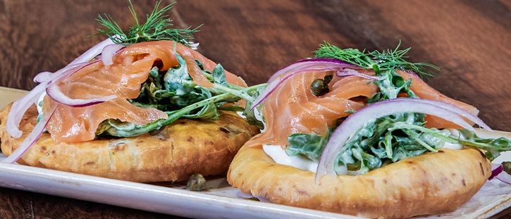 kendall brook smoked salmon, herb cream cheese, green goddess frisée, fried capers, crispy tortillas, shaved red onions, dill