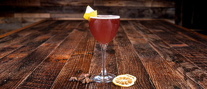 bourbon and pomegranate corpse reviver riff- Kentucky straight bourbon whiskey, OBC citrus infused vodka, fresh-squeezed lemon juice, grenadine syrup, simple syrup, absinthe rinse, lemon oil