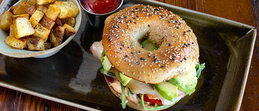 butter-toasted “everything” bagel, smoked turkey, avocado, vine ripe tomatoes, arugula, provolone cheese, remoulade; seasoned breakfast potatoes